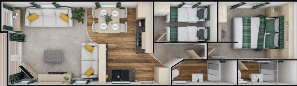 Atlas Debonair-10 This Atlas Debonair-10 offers a perfect blend of modern amenities and traditional charm, providing a comfortable and stylish retreat for all the family to enjoy. Sleeps Size 40ft x 12ft Park Cwm Hafren Key features Double glazed & central heatingOpen plan living areaFeature fireplaceCountry style interior themeMaster bedroom with vanity unit & en-suitePlenty of storage Description The Debonair interior embodies the essence of country home living. The lounge is furnished with freestanding 2 and 3 seater sofas adorned with cosy fabrics and contrasting throw cushions. The lounge also boasts a log-burner style electric fire set within a traditional mantelpiece. The freestanding farmhouse style dining table is accompanied by matching chairs that seamlessly carry on the country theme throughout the space. The holiday home features a charming farmhouse-style kitchen equipped with an integrated oven, 5-ring gas hob, electric cooker hood, and integrated fridge/freezer. The kitchen units are a combination of standard and glass-fronted doors, adding a touch of elegance to the space. Moving on to the master bedroom, you will find traditional styling with fitted furniture and a king-size bed. The room also includes a vanity unit with a mirror and stool, allowing for convenience and comfort. Natural light fills the room through the large three-quarter height window, creating a bright and inviting atmosphere. The bedroom is complete with an en-suite bathroom, featuring a shower, washbasin and WC for added convenience. The second bedroom is equipped with two single beds and a built-in wardrobe with overbed storage. The main bathroom boasts a spacious shower cubicle, a stylish countertop washbasin with a storage cabinet below, a heated towel rail, WC, and an external extractor fan. Overall, this holiday home offers a perfect blend of modern amenities and traditional charm, providing a comfortable and stylish retreat for all the family to enjoy.